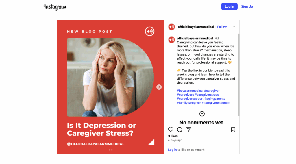 Voici à quoi cela peut ressembler dans la vraie vie. Si vous consultez Bay Alarm Medical, vous verrez que la marque ne publie pas de contenu destiné aux utilisateurs âgés qui ont besoin d'aide, malgré la vente de systèmes d'alerte médicale. Au lieu de cela, son public cible principal est constitué de soignants qui sont les plus susceptibles de vouloir acheter ce type de produits. En se concentrant sur ce sous-ensemble très spécifique de ses clients idéaux, la marque parvient à constituer une audience de prospects à forte valeur ajoutée. De plus, en centrant sa stratégie de marketing sur les réseaux sociaux autour de ce segment d'audience, Bay Alarm crée une communauté forte, extrêmement influente dans le créneau de la marque et qui a le potentiel de générer une preuve sociale exceptionnellement puissante, garantie de générer de nouvelles conversions.