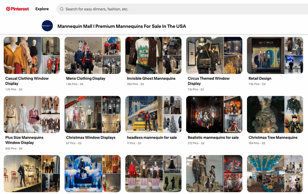 Mannequin Mall, par exemple, n'utilise pas les médias sociaux pour décrire ses produits, même s'il vend des mannequins et des formes vestimentaires de la plus haute qualité au monde. Au lieu de cela, elle base la quasi-totalité de sa présence numérique sur l’aide aux acheteurs potentiels pour trouver l’inspiration en matière de merchandising. Son profil Pinterest, par exemple, regorge de vitrines et de designs de vente au détail créatifs et uniques, ce qui est le choix parfait, étant donné que les clients de la marque ne veulent pas seulement acheter des mannequins pour leurs vitrines en magasin. Au lieu de cela, ils veulent des solutions qui les aideront à mieux commercialiser leur offre, d'une manière qui s'alignera sur leur stratégie de marque, les tendances actuelles, et qui seront suffisamment adaptables pour les servir dans le futur.